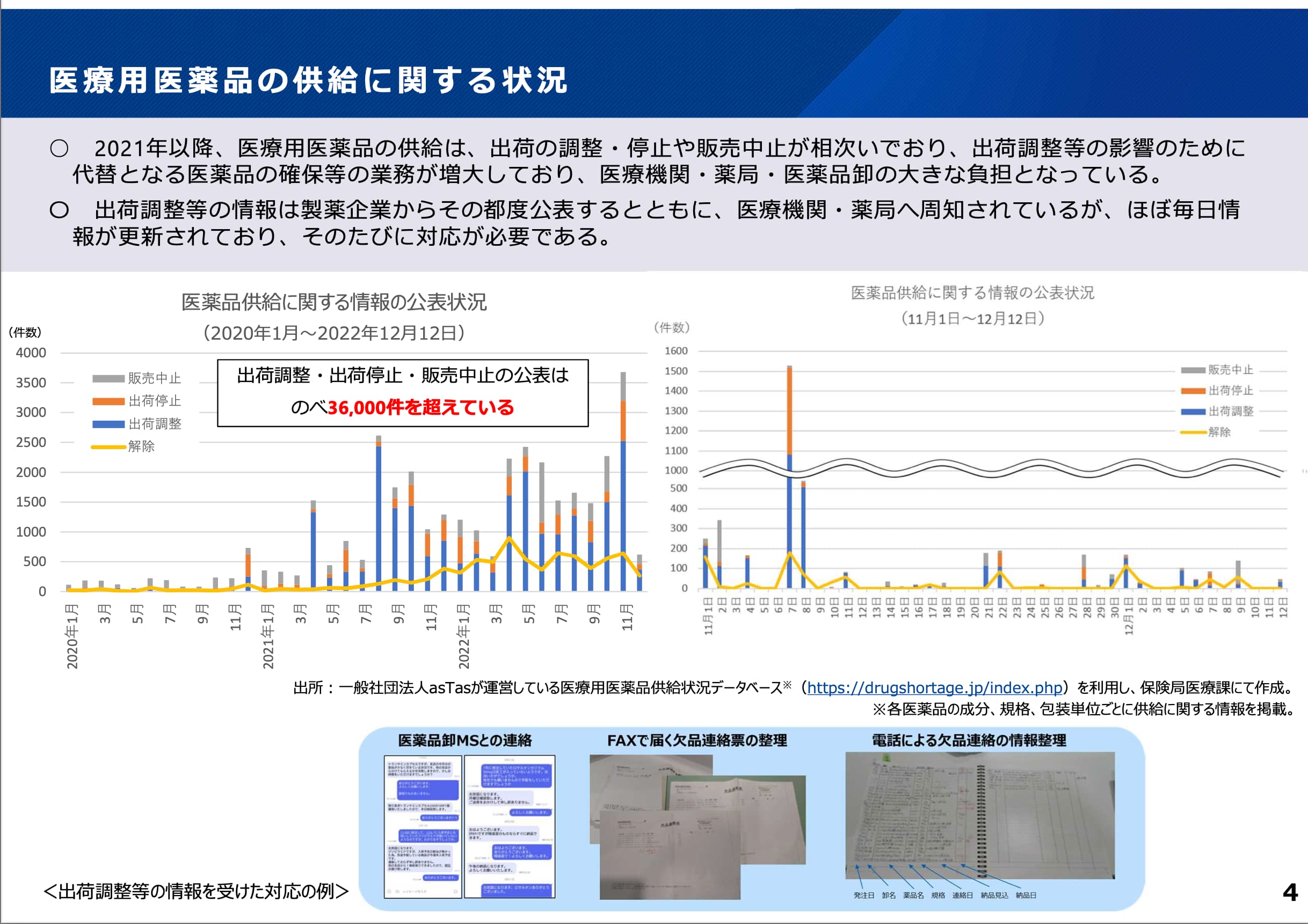 2022年12月21日に開催された中央社会保険医療協議会(以下、中医協) 総会(第534回)の資料の中で、一般社団法人asTas(あすたす)が運営する医療用医薬品供給状況データベース(DSJP https://drugshortage.jp)のデータを元にしたグラフが使用されています。