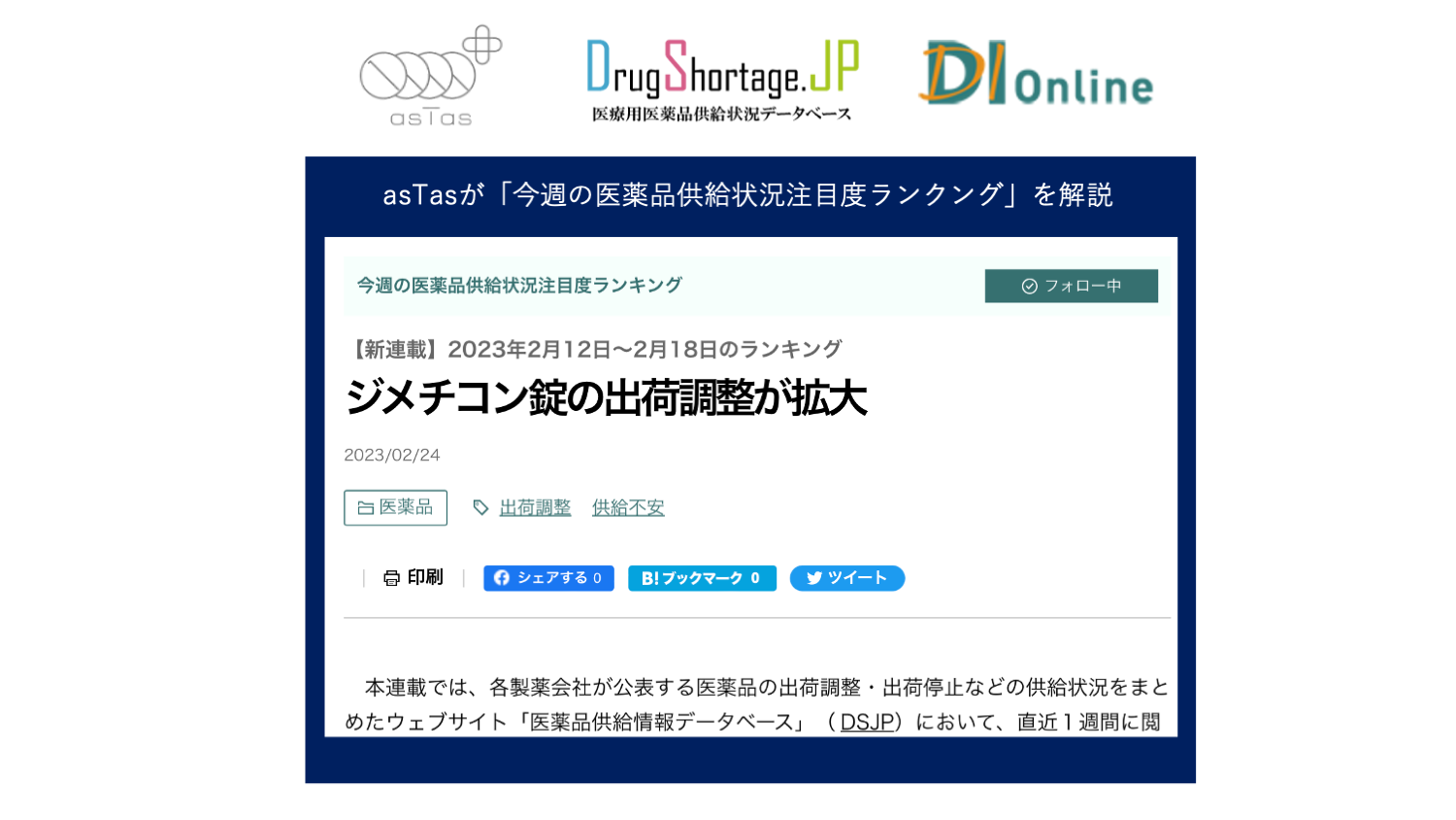 一般社団法人asTasは、2023年2月24日より日経ドラッグインフォメーション Online(略称:DI Online)にて連載を開始しました。asTasが運営する医療用医薬品供給状況データベース(DSJP)において、直近1週間に閲覧された回数の多い医薬品名のランキングを公開し、ランキング上位の製品が注目された背景について解説します。